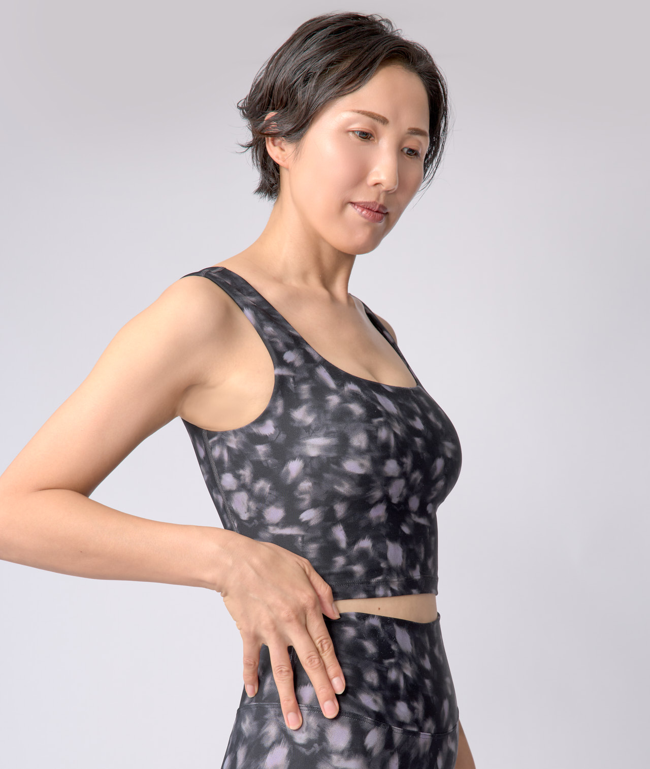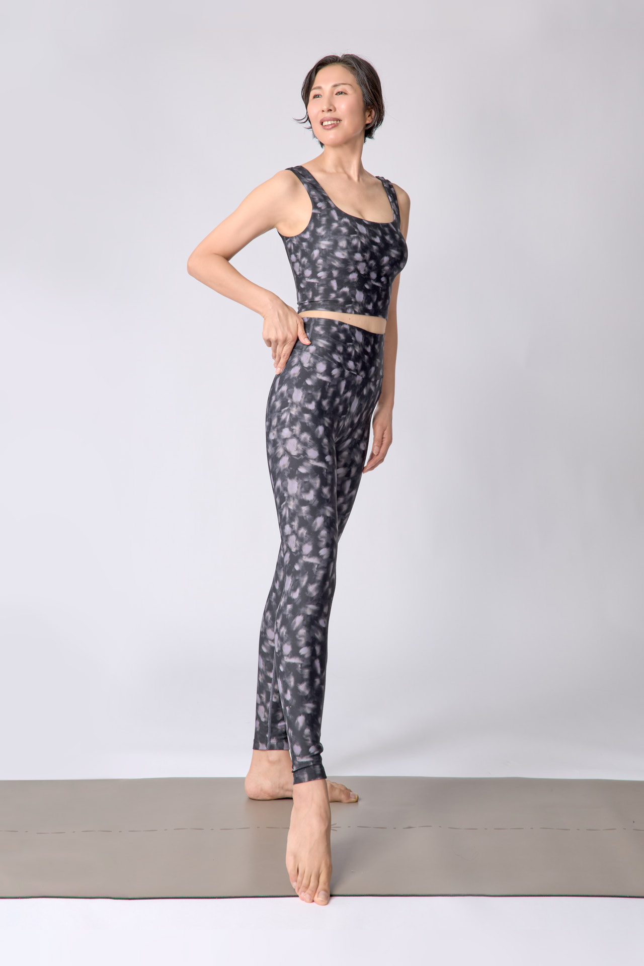 「easyogaの魅力は、唯一無二のデザイン、美しいシルエットと驚きの耐久性と吸い付くような着心地です。他にもウェアは沢山持っていますが、着心地が良すぎて、気づいたらeasyogaばかり週3で2年間着用していました。ガシガシ洗って制服のように…。そこまで着用すると消耗してくるのが普通なのですが、生地が薄くなったり形も崩れたりせず、柄の発色も変わらずでした。この生地の上質感、“本物”をぜひ皆さんにも知ってほしいです。」