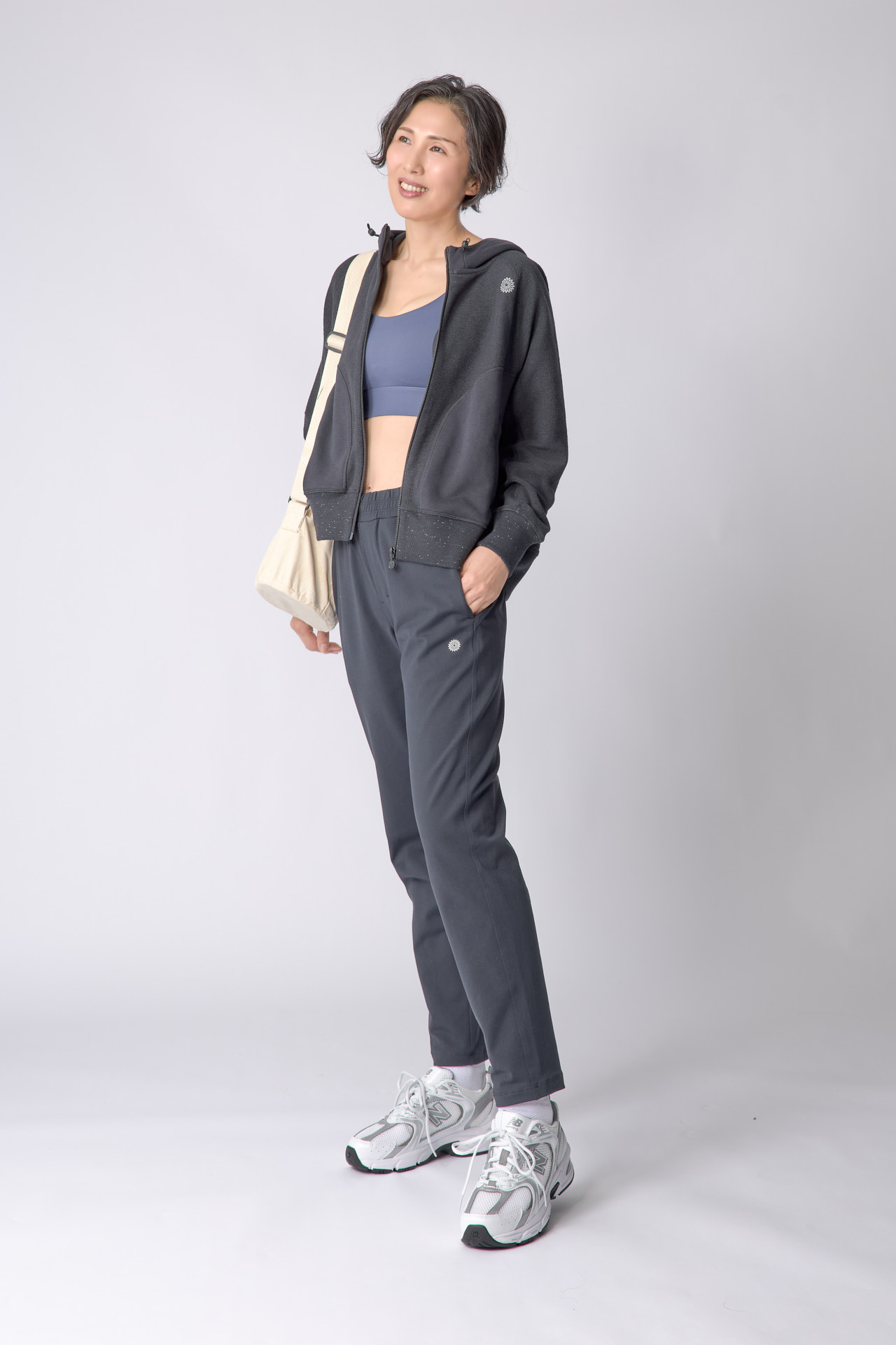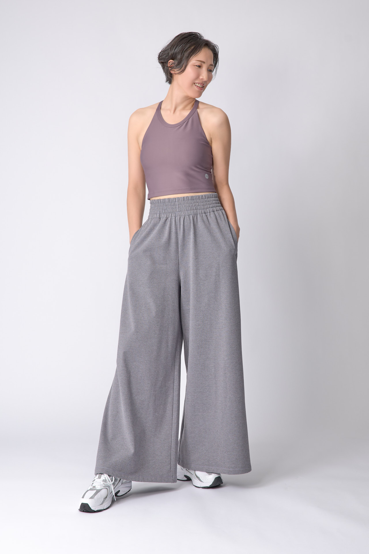 「フリースパンツは大好きで色々な形を持っていますが、新作パンツのワイドな美脚シルエットに一目惚れ!大好きなスモーキーカラーのトップスにも合う、汎用性の高いグレーも素敵。防寒性もあってレッスン以外でも秋冬のオシャレに一役買いそうです。」