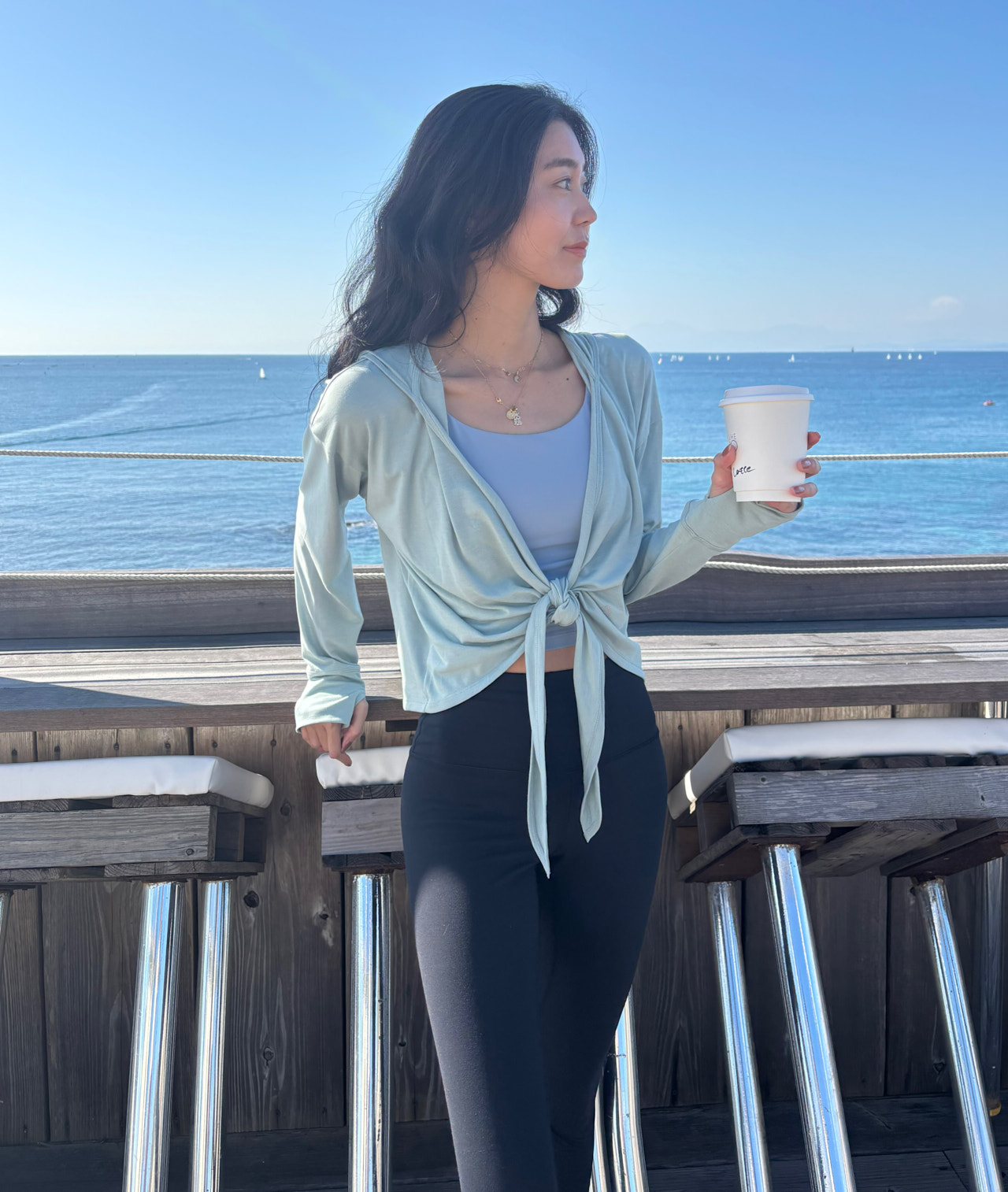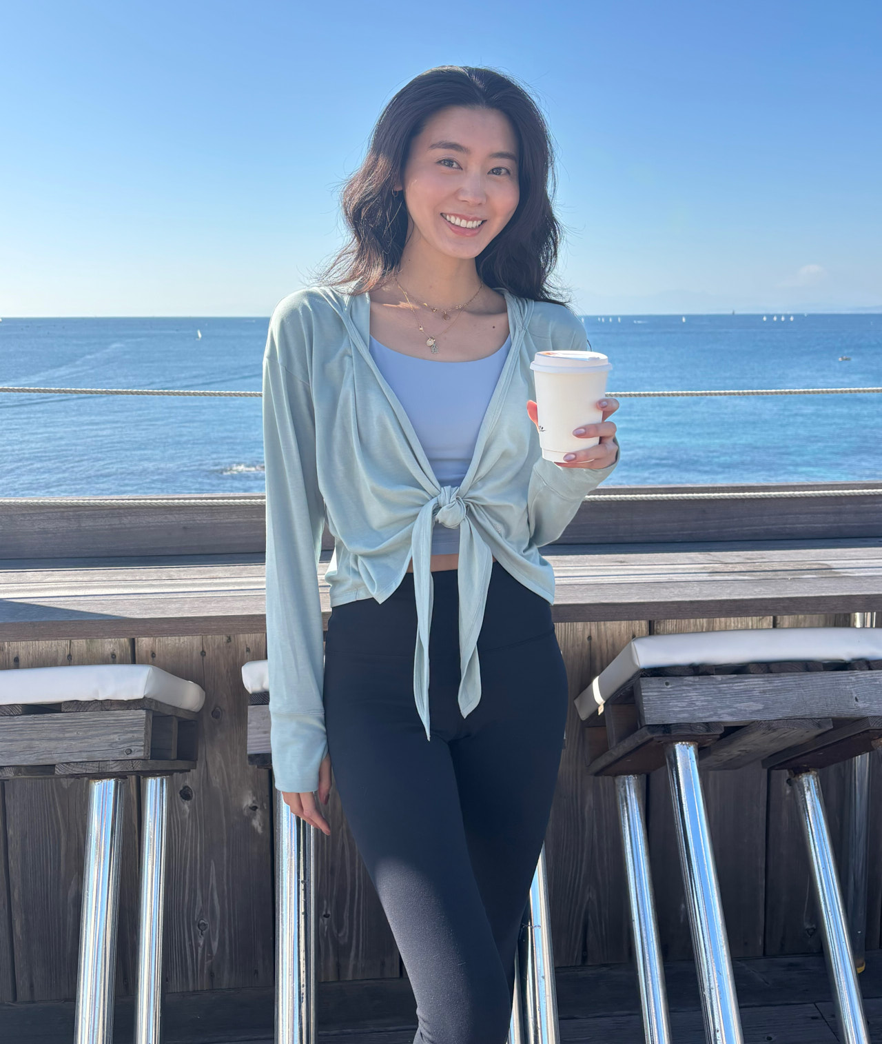 軽くて、ラフにバッグに入れてもシワになりにくく、さらっと羽織れるのが嬉しいです。結ぶとシルエットキュッと締まって見え、ほどくとラフで抜け感が出て、どちらも雰囲気が違って好きです。袖のサムホールで手の甲まで覆えるので、最近野外ヨガをしたときも日焼け対策になって万能でした!