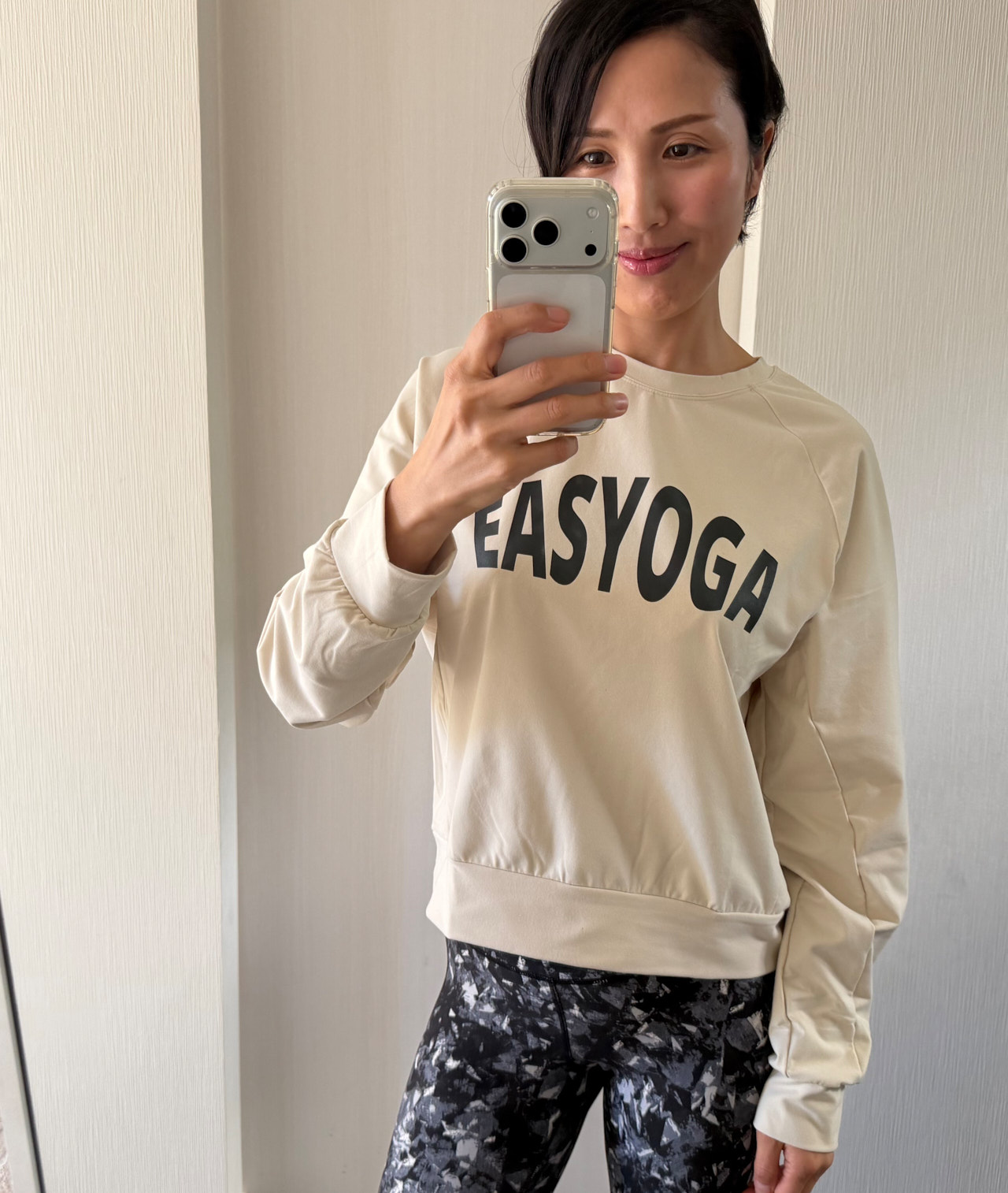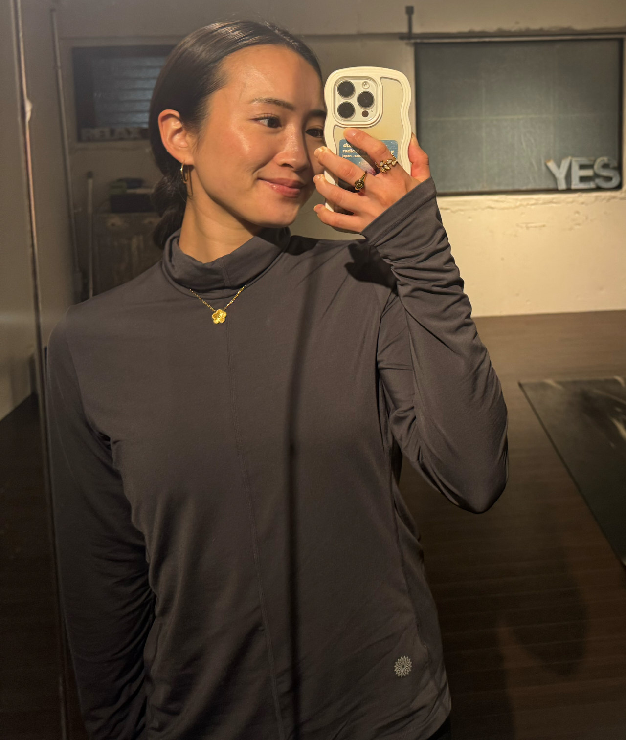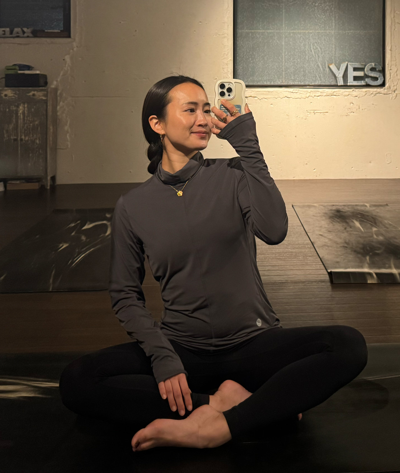 冬になるとヨガウェアだけではどうしても寒いのですが、このトップスは首元までしっかりカバーしてくれるのに、ピタッとしすぎず、シルエットがとても綺麗。動きやすさと暖かさの両方を叶えてくれるので、冬のレッスンにぴったりです。“ヨガの時だけ”ではなく普段使いにも自然に溶け込むデザインが素敵です。
