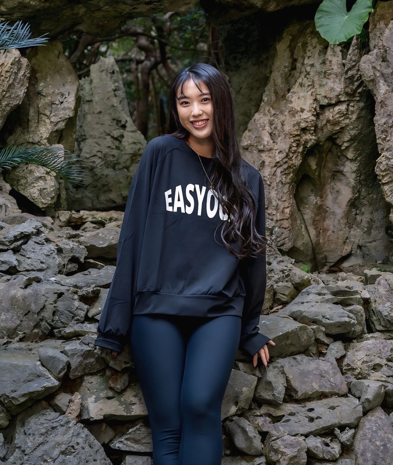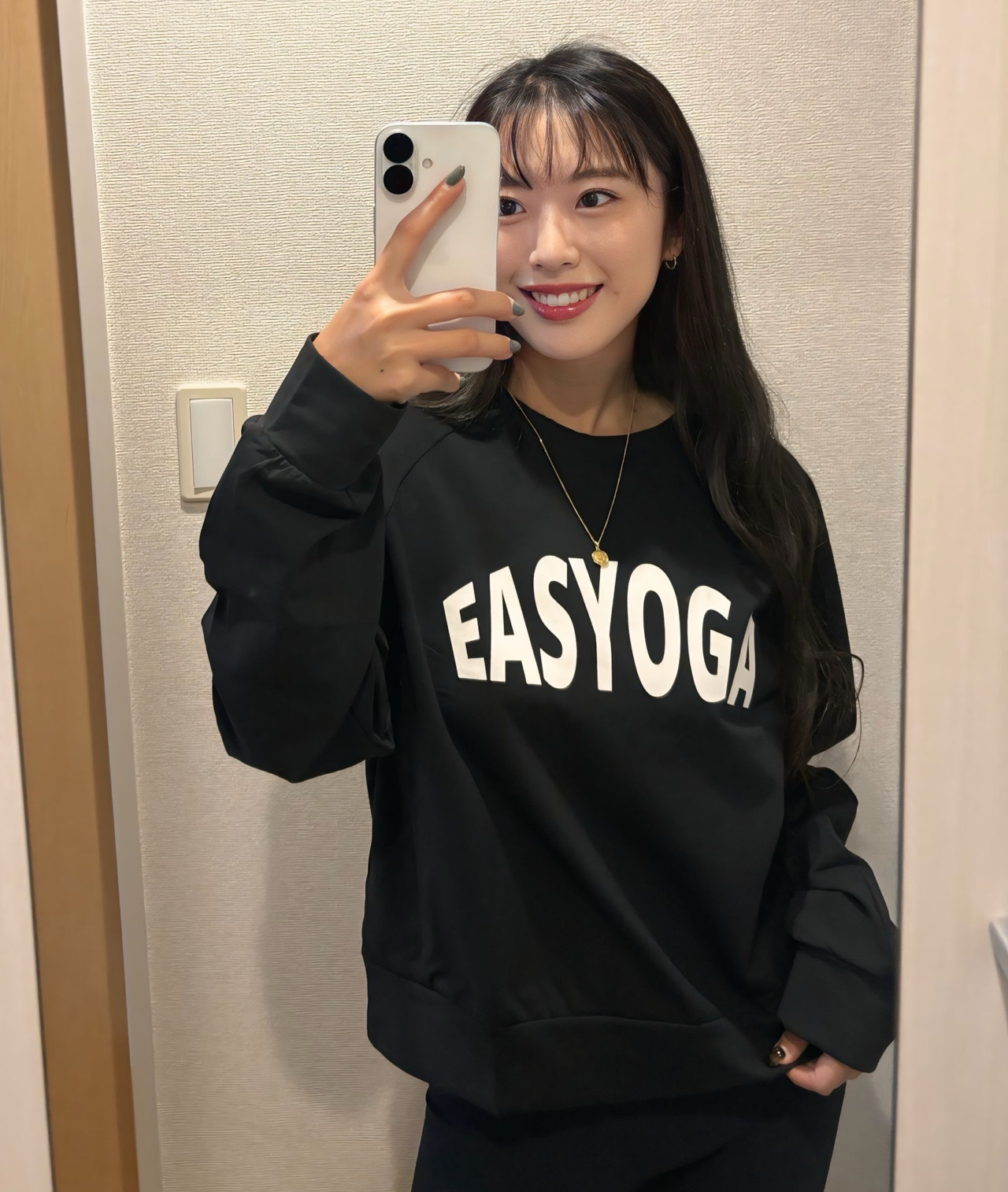 少し肌寒くなってきた沖縄では大活躍のスウェット。レギンスを合わせてヨガはもちろん、デニムに合わせてカジュアルにお出かけする時にも愛用しています。そして丈が短いので脚長効果も嬉しいポイントです!スタイリッシュなデザインで身体のラインをシャープに見せてくれるので、黒のウェアは必須アイテムです。