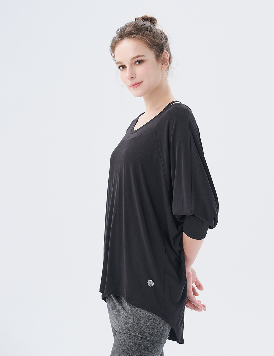 ラグランスリーブで着用したままヨガもしやすく、着脱もしやすいシンプルなカジュアルトップス。カジュアル見えしない上質な生地の光沢感と滑らかさは、一度着用したら病みつきに。