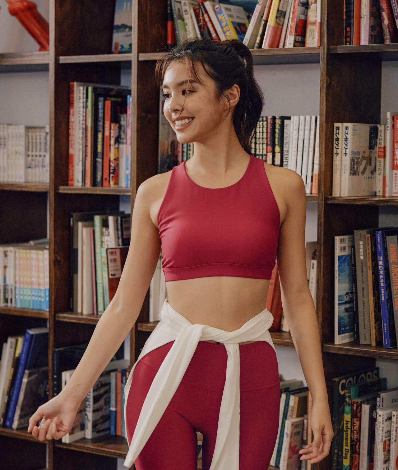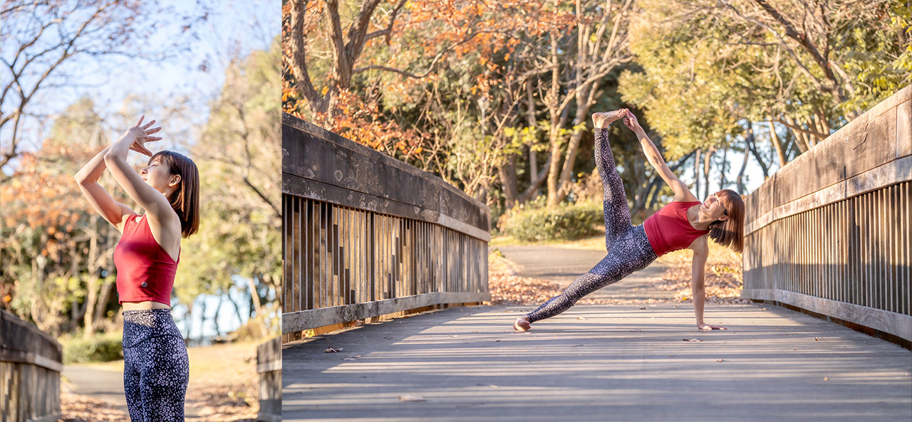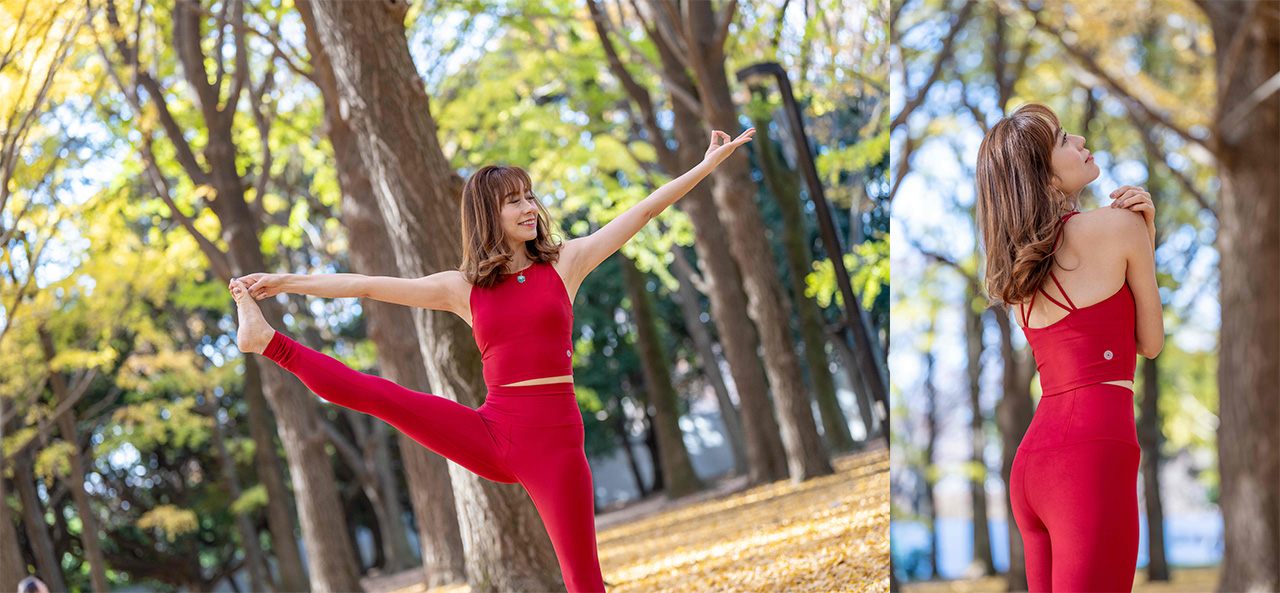easyogaのレッドアイテムを愛用しているヨガインストラクターさんの着こなしをご紹介。ぜひ着こなしの参考にしてみて。